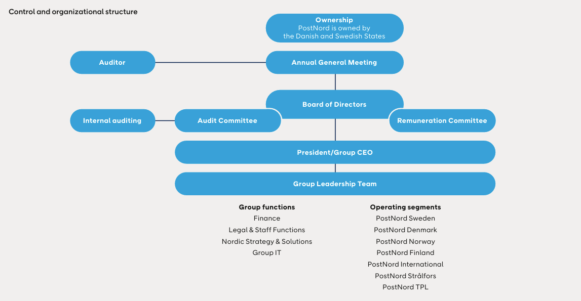 PostNord’s governance structure is briefly summarized below. A complete description can be found in PostNord’s latest Corporate Governance Report.